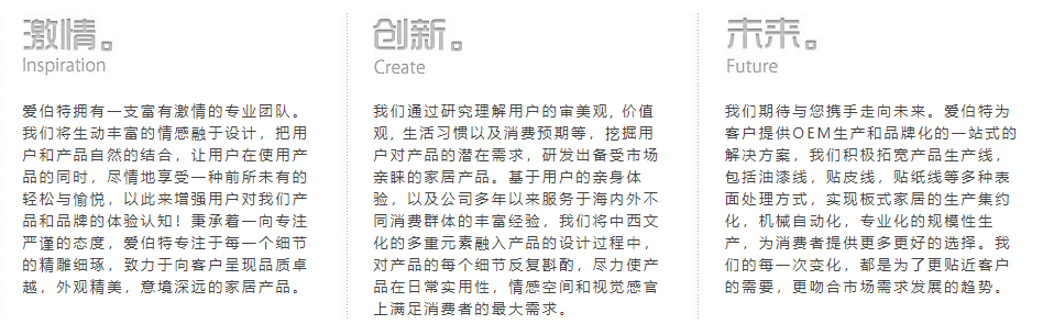 愛伯特家居有限公司屬中外合資企業(yè),成立于2007年,坐落于福建漳州北斗工業(yè)園區(qū),占地66000平方米。對于板式家具,木質(zhì)家居產(chǎn)品,我們專業(yè)的團隊有著世界頂級的生產(chǎn)能力,產(chǎn)品原料及品質(zhì)要求符合國際各類管理體系的標準。愛伯特自創(chuàng)始之日起至今,始終保持超乎尋常的成長速度。我們與(HomeDepot,Lowes,Aldi,Lidl